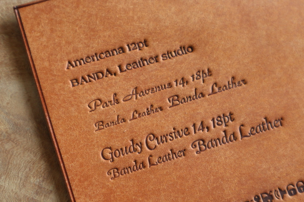 You can add initial imprint to the leather pen pouch in English with the option. Marked with an indentation (hot-shot of the type), the imprinting typeface is imprinted using a cursive font called Park Avenue.
