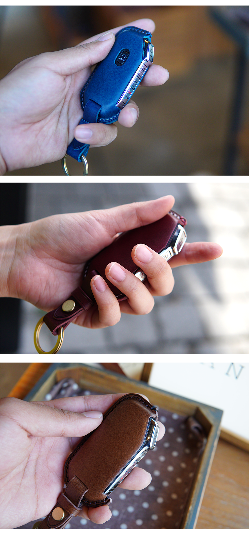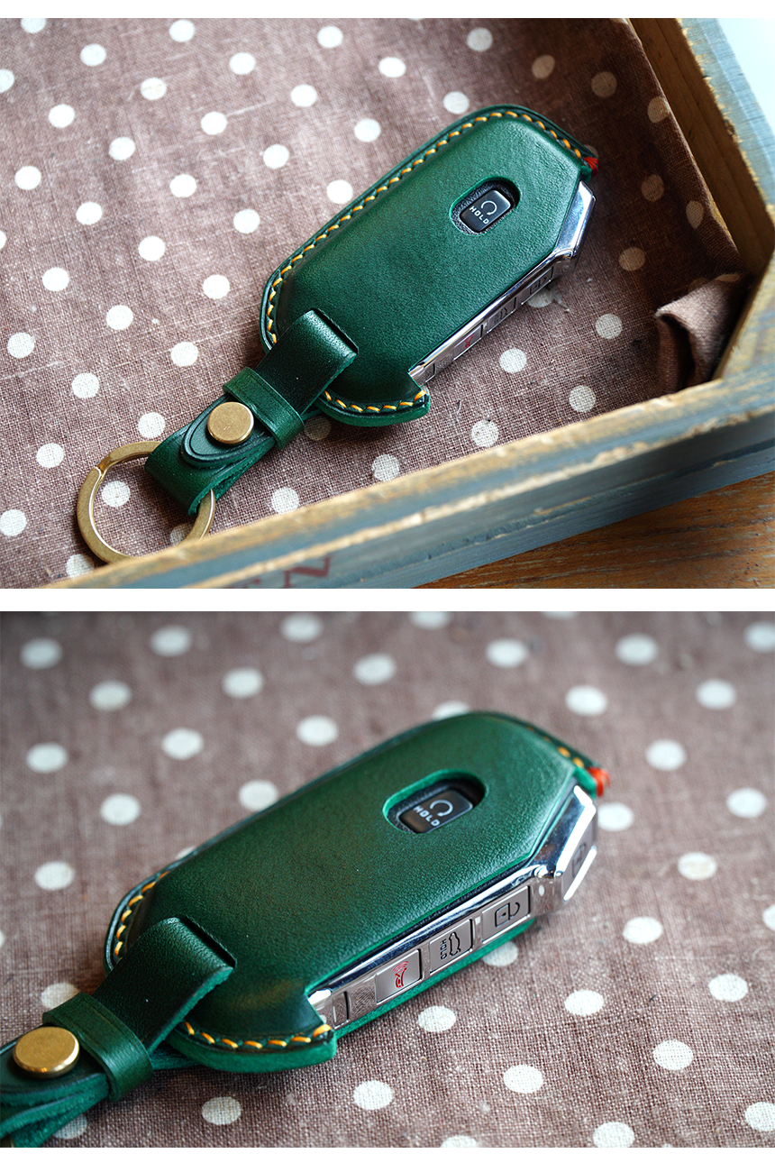 This is KIA Telluride Seltos K7 K5 Niro Sportage Soul etc.. smart car key leather case. Leather molding techniques allow you to create the same shape as the Smart key and fit perfectly into the Smart car key as if you are wearing customized clothes. The leather and subsidiary materials used in the production are Art.Buttero Vegetable Leather and brass. The luxurious buttero leather and brass decorations are a combination of materials that give a good impression of leather products, and the aging leather and brass will make the world my only cherished item.