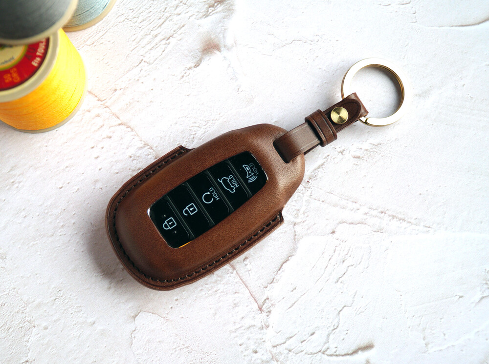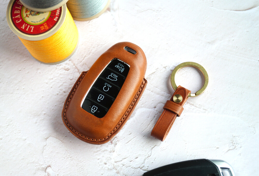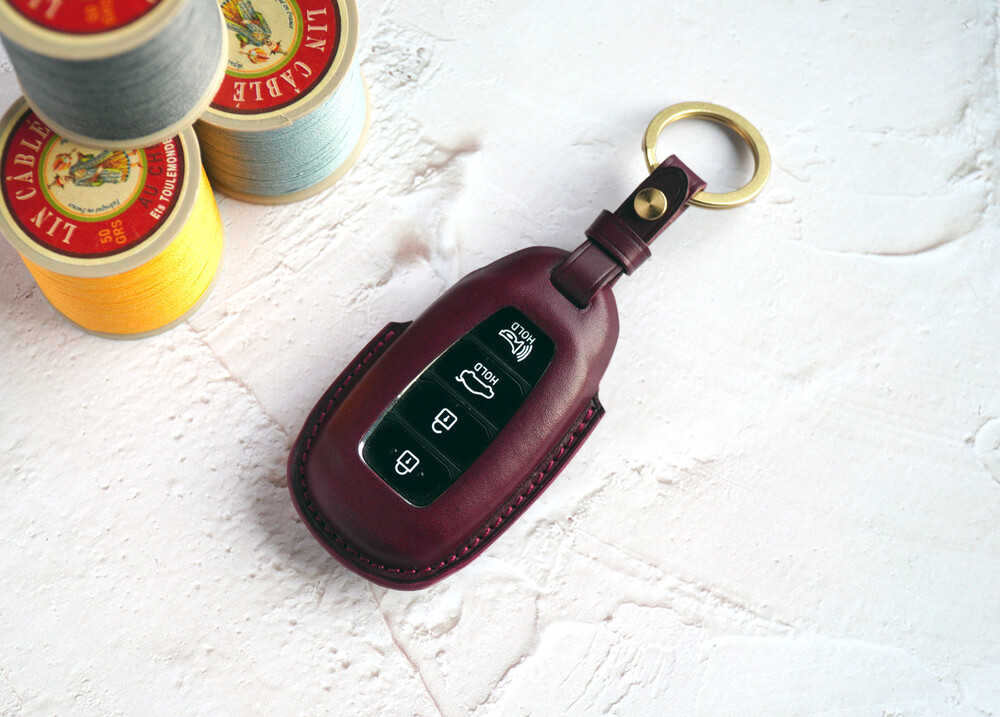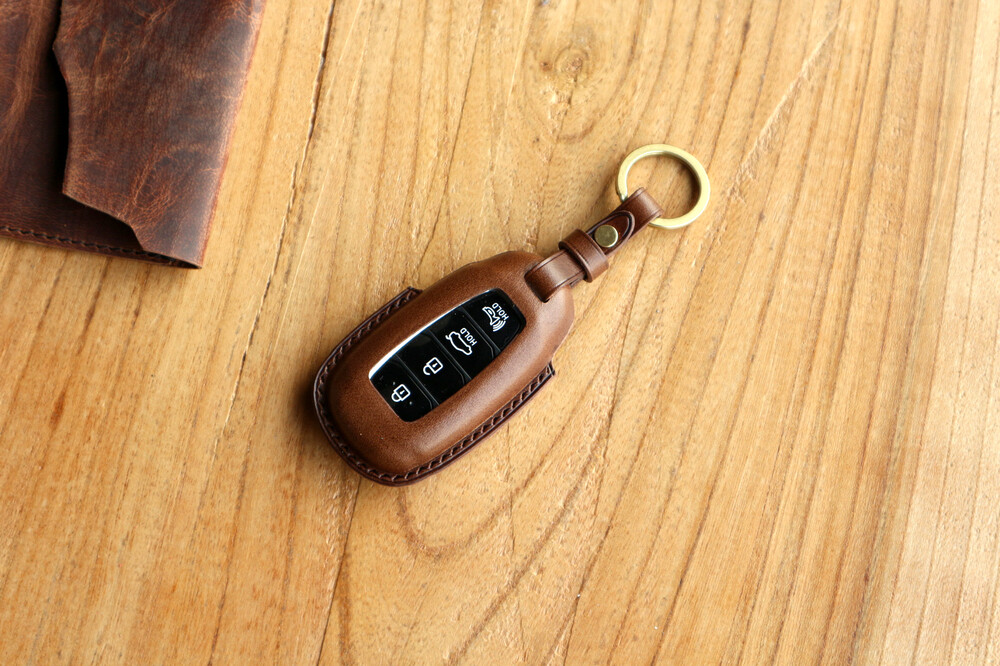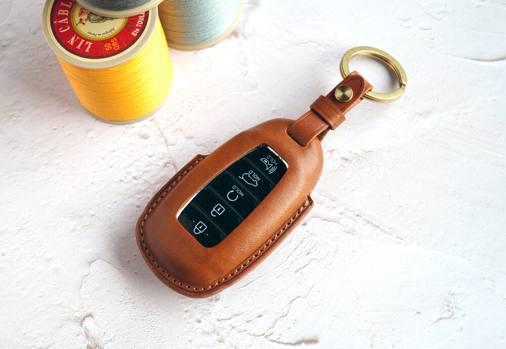 This is HYUNDAI Kona, Palisade, Santafe, Veloster, Elantra etc.. smart car key leather case. Leather molding techniques allow you to create the same shape as the Smart key and fit perfectly into the Smart car key as if you are wearing customized clothes. The leather and subsidiary materials used in the production are Art.Buttero Vegetable Leather and brass. The luxurious buttero leather and brass decorations are a combination of materials that give a good impression of leather products, and the aging leather and brass will make the world my only cherished item.
